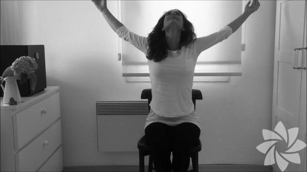3- Ellerinizi omuzlarınıza yerleştirin. Omuzlarınızı çevirmeye başlayın. Yine nefesinizle birlikte, yavaş ve nazik olun. Gözleriniz kapalı olabilir. Nefes alırken yarım daire omzunuzu çevirin, nefes verirken daireyi tamamlayın. 3 / 5
