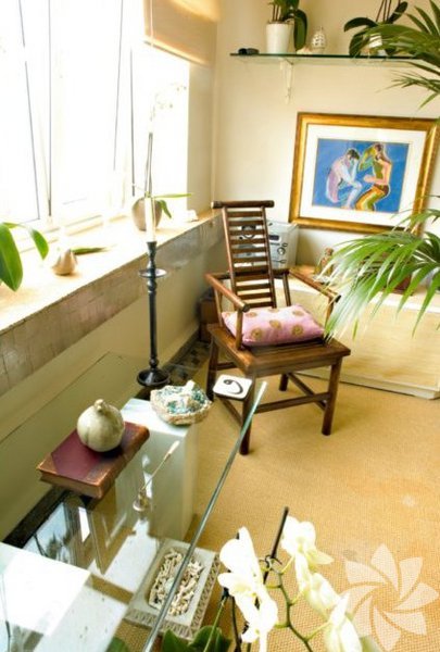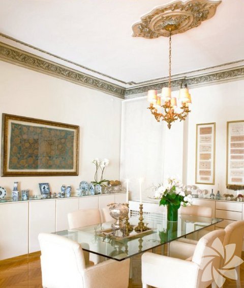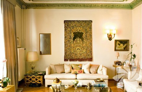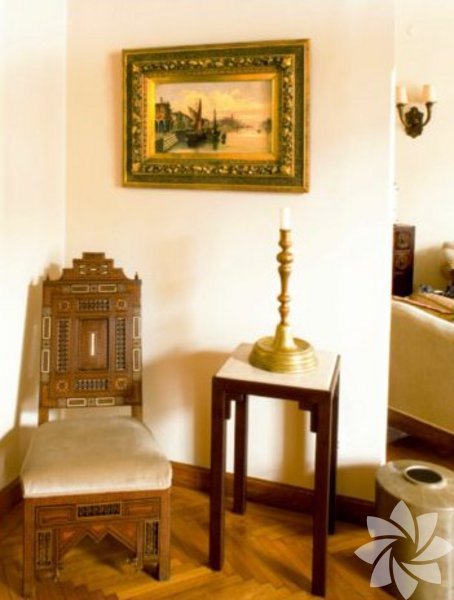 Salonun ana oturma köşesinde mekana özel yaptırılan koltuklar Rıfat Özbek’in İpek koleksiyonuna ait yastıklarla süslenmiş. Gedik Cam’a yaptırılan orta sehpanın üzerinde tombaktan yapılan gülabdanlar, sahan, kahvedan, buhurdan, kemer tokasının yanı sıra Osmanlı sineklik ve zarflar yerleştirilmiş. Sol taraftaki yan sehpanın ayağı bir köşkün tırabzan altı kullanılarak, merdiven yanları birleştirilerek yapılmış üzerine cam ile tamamlanmış tasarım antikacıdan alınmış. Üzerindeki aydınlatma Manhattan Mobilya’dan alınmış ayrıca üzerinde antika tombak kemer tokası ve tombak zarflar bulunuyor. Üzerindeki çerçevede 18. yüzyıl sonu eski bir Osmanlı tekstili, hemen yanında büyük tekstil Sotheby’s’den alınmış 19. yüzyıl başına ait Manyaluka (Manyaluka, yün dokuma üzerine uygulanan renkli dokuma parçalarının, suzani tekniği ile birleştirilerek tasarlanmasına verilen isim) seccade asılı. 19. yüzyıl stili aplikler İngiliz stili. Osmanlı cariyesinin resmedildiği tablo anonim bir eser, müzayeden alınmış. 19. yüzyıl Fransız masanın üzerinde Süleymaniye işi bir zarf ve sakızlık, içi kurutulmuş gül dolu tombak tas ve zemzemlik bulunuyor. Herend marka bonboniere Serdar Gülgün tasarımı.