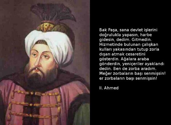Bak Paşa, sana devlet işlerini doğrulukla yapasın, harbe gidesin, dedim. Gitmedin. Hizmetinde bulunan çalışkan kulları yakasından tutup zorla dışarı atmak cesaretini gösterdin. Ağalara araba gönderdin, yeniçeriler ayaklandı dedin. Ben de zorba aradım. Meğer zorbaların başı senmişsin!