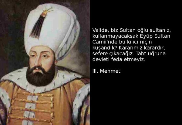 Valide, biz Sultan oğlu sultanız, kullanmayacaksak Eyüp Sultan Camii'nde bu kılıcı niçin kuşandık? Kararımız karardır, sefere çıkacağız. Taht uğruna devleti feda etmeyiz.