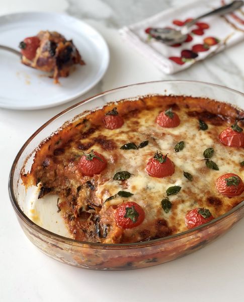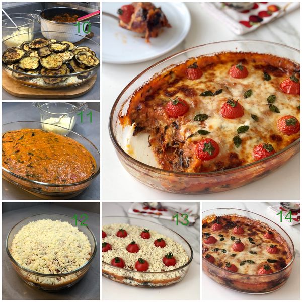 Peynirin üzerine patlıcanların diğer yarısını, kalan domates sosu ve peyniri serpin. Çeri domatesleri üzerine yerleştirip 200 derecede ısıtılmış fırında peynirler eriyip kızarana kadar yaklaşık 20 dakika pişirin.