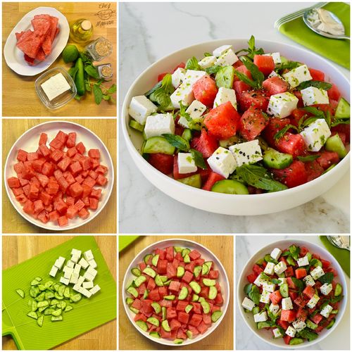 Sıcak yaz günlerinde kahvaltı sofraları için veya ara öğün olarak kısa sürede hazırlayabileceğiniz nane ve lime ın ferahlatıcı lezzetinin çok yakıştığı peynirli karpuz salatası.