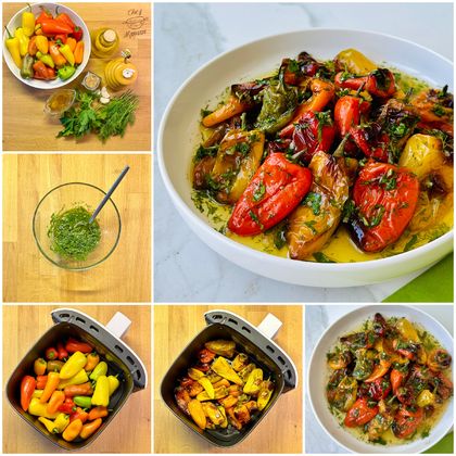 • Biberleri yıkayıp kurulayın, bıçak yardımıyla kenarlarına minik delikler açarak airfryer ın haznesine yerleştirin ve sebze ayarında kızartın (20 dakika).