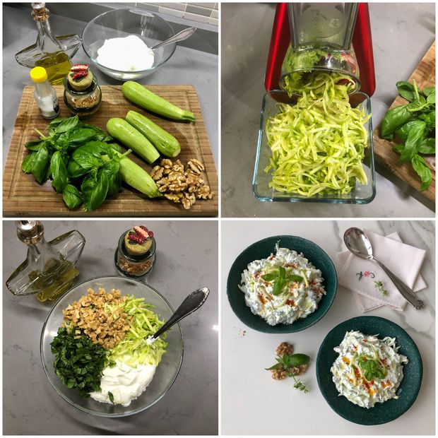 *Kabakları yıkayıp kabuklarını soymadan rendeleyin. Fesleğenleri yıkayıp incecik doğrayın. Ceviz içlerini elinizle iri parçalara ayırın.
