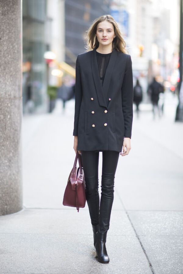 Deri pantolon, siyah bir ceket ve botlarınızla asil bir görünüm elde edebilirsiniz.