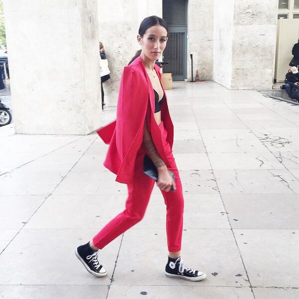 Kırmızı takımın içine giyilen dantelli büstiyer ve converse ile tamamlanmış asi uyumu.