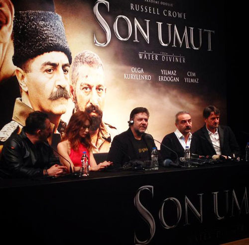 Son Umut'u büyük bir sır gibi saklanan, korsan kayıt yapılmasın diye cep telefonlarının gösterimin yapıldığı salona alınmadığı, gazetecilerin tümüne buna dair bir de sözleşmenin imzalatıldığı ve Russell Crowe'la Cem Yılmaz'ın şakacı tavırlarıyla adından söz ettiren 5 Aralık günkü basın gösteriminde izledim. Filmin ardından yapılan basın toplantısına da katıldım ve hatta pek huyum değildir ama en ön sıraya oturdum oradan izledim, dinledim ve bol bol güldüm, tabii normalde Russell Crowe'la da pek sık karşılaştığım söylenemez zaten. Cem Yılmaz, Olga Kurylenko, Russell Crowe ve Yılmaz Erdoğan soldan sağa aynen bu dizilimde oturuyorlar karşımda, keyfim yerinde anlayacağınız...