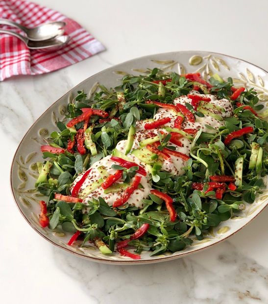 *Semizotlarını geniş bir tabağa yayın, yarım limon suyu ve iki yemek kaşığı zeytinyağı ile harmanlayın. Üzerlerine tahinli sosu kaşık yardımıyla aktarın, şerit doğranmış kapya biber, salatalık ve susamın kalanını serpiştirin.