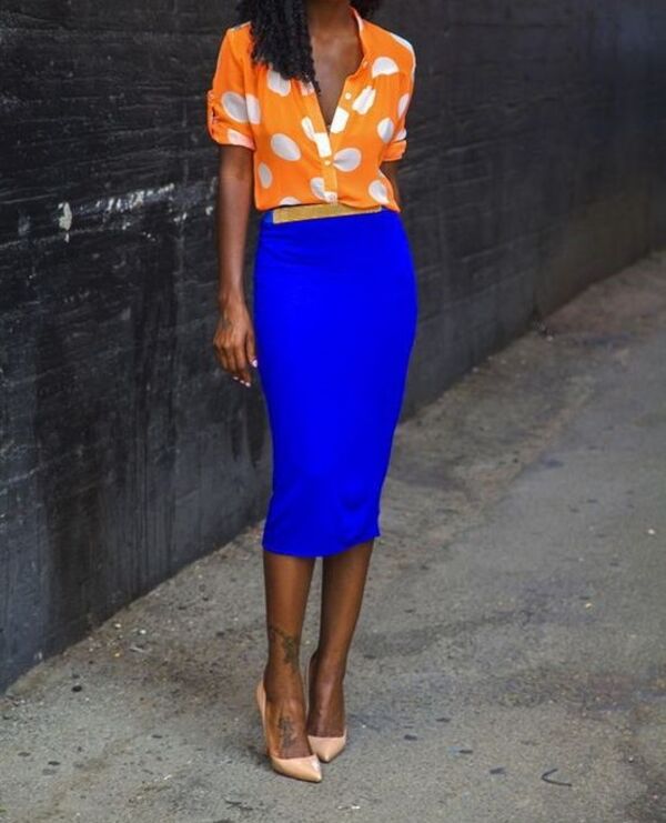 Mavinin bu tonu ve turuncu oldukça havalı bir kombin yaratmış.