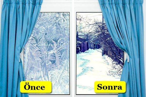 Tuzlu suya batırılmış bir süngerle pencereleri silin, bu uygulama camlarınızın donmasını engeller. Soğuk havalarda pencerelerin buz gibi olmasını önlemenin bir başka yolu da küçük bir bez torba torbayı pencerenizde tutmaktır.