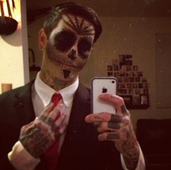 Mitch Lucker bu fotoğrafı, 1 Kasım 2012'de Huntington Beach California'da meydana gelen motosiklet kazasında ölmeden iki saat önce paylaşmıştı. İskelet gibi giyindiği bu fotoğrafa, 'ölüler yaşıyor' yorumunu yapmıştı.