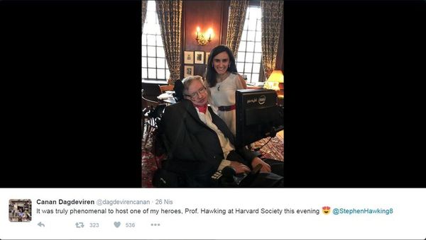 Harvard Üniversitesi Genç Akademi Üyesi ve Massachusetts Teknoloji Enstitüsü’nden genç mucit Dağdeviren, kişisel Twitter hesabından Harvard Üniversitesi’nde ağırlanan Hawking ile fotoğrafını paylaştı. Dağdeviren, Twitter’da yüzlerce beğeni alan fotoğrafın altına, “Harvard’lılar buluşmasında bu akşam kahramanlarımdan birini, Profesör Hawking’i ağırlamak tam anlamıyla olağanüstüydü” diye not düştü.