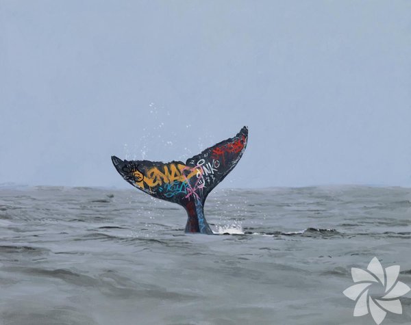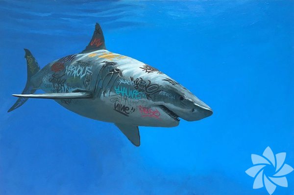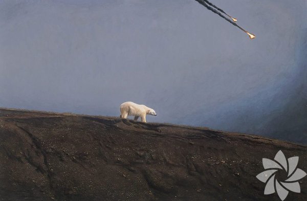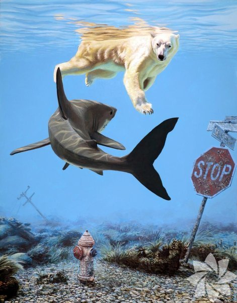 Kompozisyonlardan biri suyun altında karşılaşmış kutup ayısını ve köpekbalığını gösteriyor. Fark ediyoruz ki etrafta ve hayvanların üzerinde hala insanlığın izleri var.