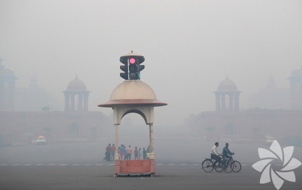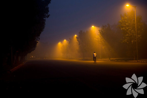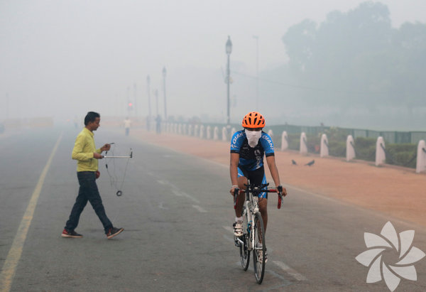 Yeni Delhi'deki havayı kirleten sebeplerden biri olarak gösterilen Diwali Festivali'nden sonraki gün, bisiklet kullananlar hava kirliliğinden kaynaklanan sis içinde pedallarını çevirdi.