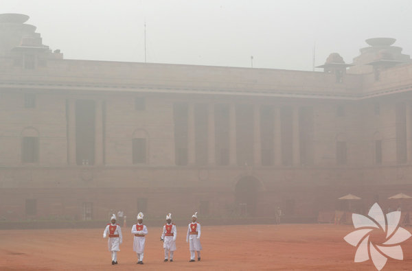 Hindistan Cumhurbaşkanlığı çalışanları... Başkanlık sarayı sisle çevrili.