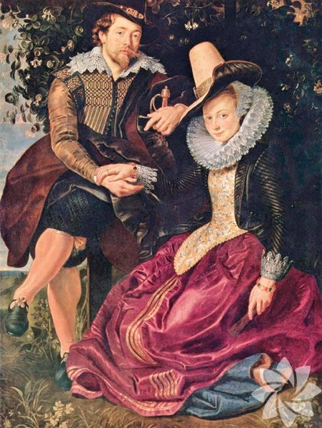 Rubens bu otoportreyi 30'lu yaşlarının başında çizdi. Ressam, dillere destan güzelliğiyle tanınan Isabella ile uzun süre İtalya'da aşk yaşayıp 1609'da evlendi. Bu tablo da evlilik hediyesi... Çift, hanımeli çardağının gölgesinde oturuyor. Çiçeklerinin tatlı bal özüyle bilinen büyük asma aşklarına bir gönderme.