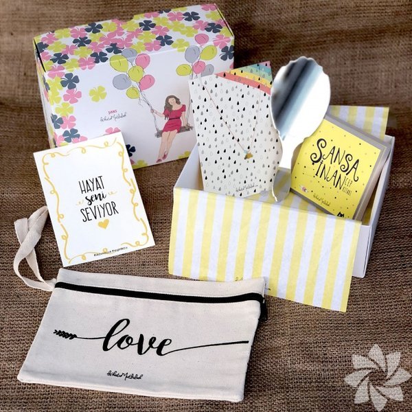 Şans kutusu, "Hayat Seni Seviyor" motto kartı, "Şansa İnan" cep kitabı -"Gülümse" masal ayna, "Love" clutch, "Bulut" rose gold kolye içeren kutuyu kendinize hediye edebilirsiniz.