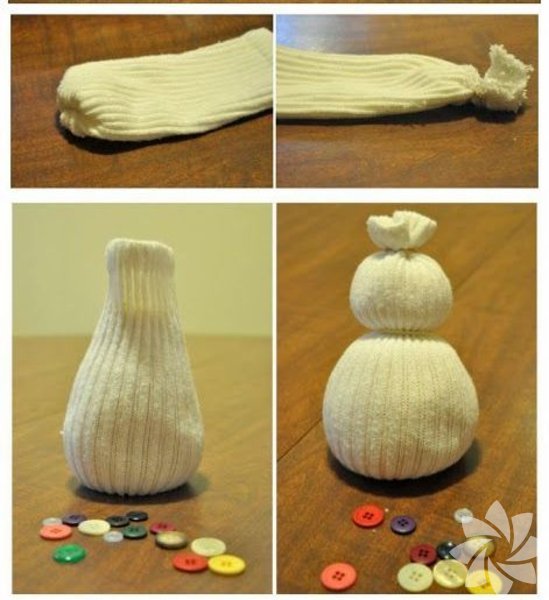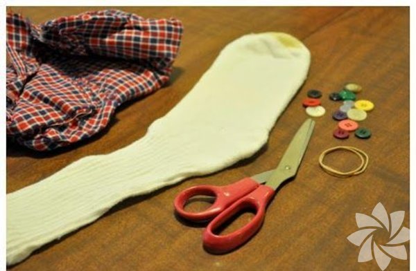 İhtiyacınız olanlar: beyaz bir çorap, birkaç düğme, iplik ya da lastik, bir miktar pamuk ve bir parça kumaş...