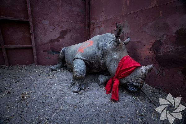 Genç bir güneyli beyaz gergedan, Botswana'nın Okavango deltasında vahşi doğaya bırakılmadan hemen önce.