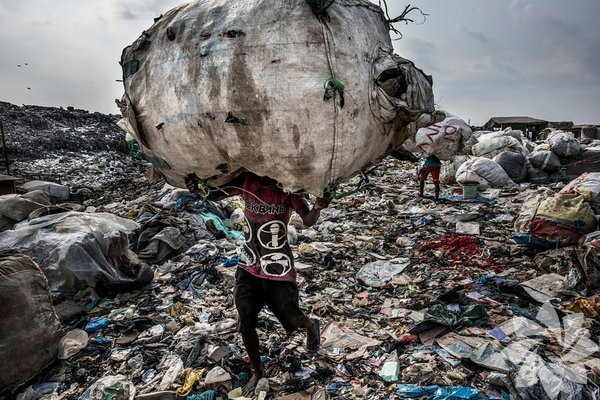 Bir adam Nijerya'daki depolama sahasında geri dönüşümleri toplamak için büyük bir torba taşıyor.