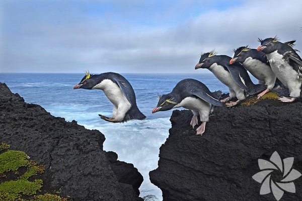 Güney Kaya penguenleri (Rockhopper), Marion Adası'nın sahil şeridinde gezinirken...
