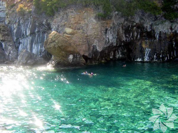 Adanın batısında mozaik görünümlü siyah ve beyaz taşlarla bezeli kumsalda denize girebilirsiniz.