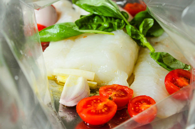 Mezgit filetosu temizlenip yıkandıktan sonra fırında tavuk pişirme torbasının içine yerleştirilir. Üzerine yarıya bölünmüş kiraz domatesler ve 4’e bölünmüş soğan konur. Zeytinyağı, limon suyu, tuz, biber serpilir ve fesleğen yaprakları eklenir. Torbanın ağzı sicili ile kapatılıp bir tepsinin üzerine konur. Önceden ısıtılmış 180°C fırında 20-25 dakika pişirilir. Üzerine sızma zeytinyağı gezdirilerek servis edilir.