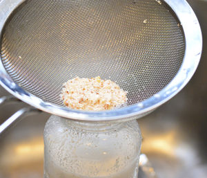 Karışımı bir süzgeçle, ya da daha iyi süzebilmek için bir tülbentle iyice süzün. Badem sütünüz hazır!