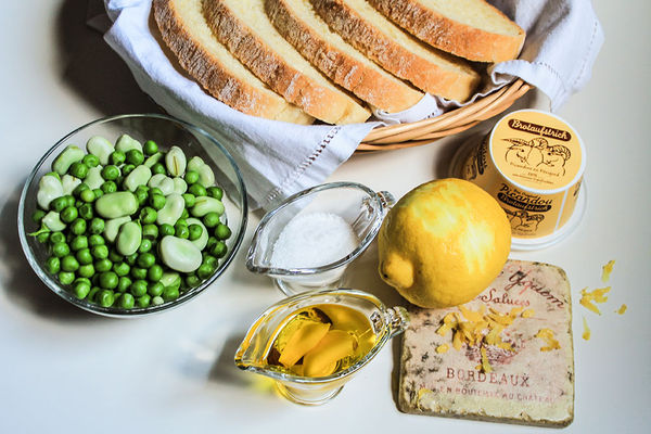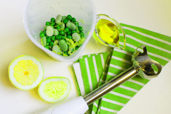 Yüksek ve dar bir kabın içinde hafif pismiş bezelye-bakla, sarımsaklı yağ, sarımsaklar, limon suyu ve kabuğu, ekstradan çiğ zeytinyağı ve tuz bir el mikseri ile püre haline getirilir. Ekmek kızartılır, üzerine önce keçi peyniri ardından da yeşil humus konarak servis edilir.