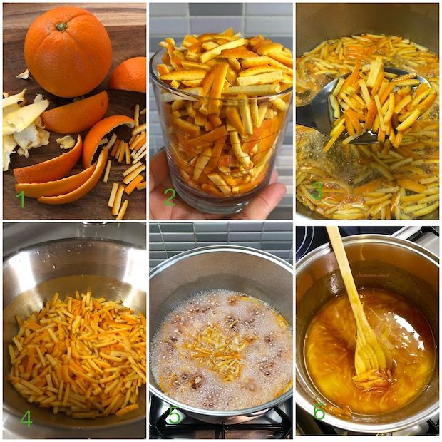2) Portakal kabuklarını incecik doğrayarak tencereye alın, üzerini dört parmak aşacak gibi su ekleyerek ocağı orta ateşe ayarlayın, kaynamaya başladıktan sonra 15 dakika haşlayın. Suyunu süzdürüp üzerine soğuk su dökerek dört-beş defa bu suyu değiştirin (portakal kabuğunun acımsı tadının çıkması için 10 dakikada bir, en az dört defa suyunun değiştirilmesi gerekir).