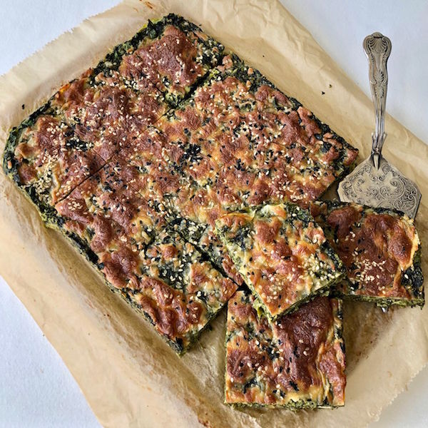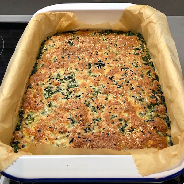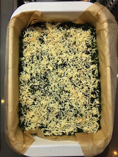 4) Fırın kabını pişirme kağıdı ile kaplayarak ıspanaklı harcı kaba alın ve üzerini spatula ile düzeltin.