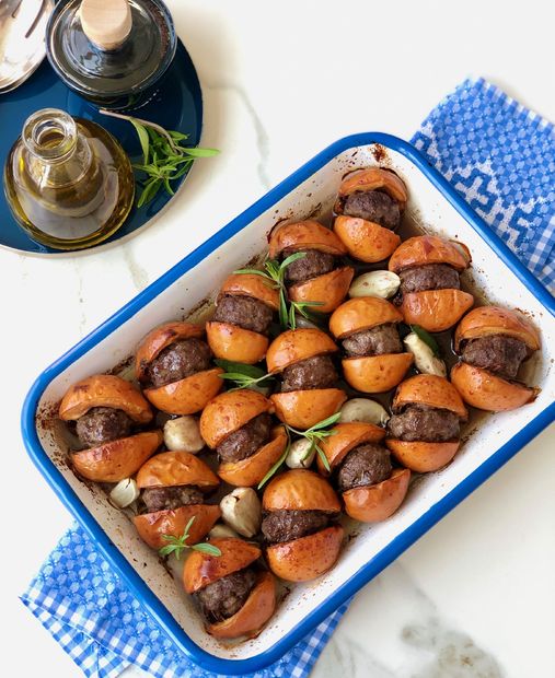 *Kebap için kıyma karabiber ve tuzu iyice yoğurun, kabuklu ceviz boyutunda yuvarlayıp yeni dünyaların içine yerleştirin ve fırın kabına dizin. Aralara sarımsakları serpiştirin. Kabın üzerini önce pişirme kağıdı, sonra folyo ile kaplayarak 190 derecede 10 dakika önceden ısıtılmış fırında 30 dakika pişirin. Bu süre sonunda folyo ve pişirme kağıdını çıkartarak nar ekşisi & zeytinyağı karışımını fırça yardımıyla üzerlerine sürün ve fırında yaklaşık 15 dakika kızarana kadar pişirin.