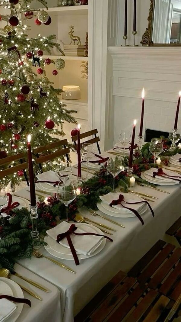 Kırmızı, beyaz ve altın renklerini masa örtüsü, tabaklar ve peçetelerde kullanabilirsiniz. Buna ek olarak kozalak, kuru çiçek, yapay çelenk ve kokinalarla masanıza zarif bir görünüm kazandırın.