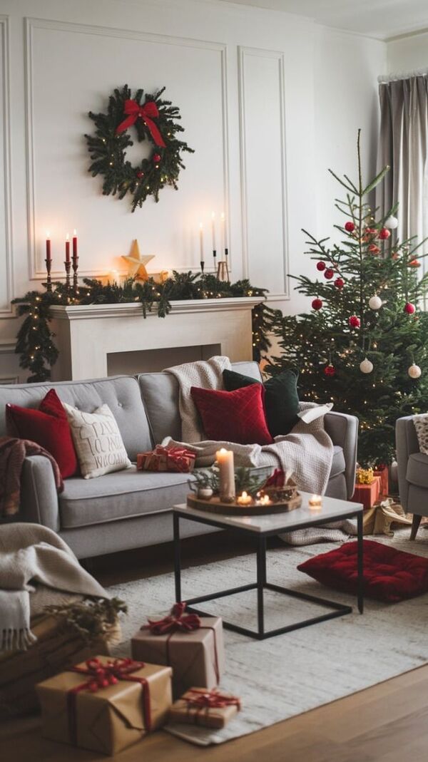 Kırmızı, yeşil ve altın tonlarının hakim olduğu dekoratif unsurları kullanabilirsinizç
