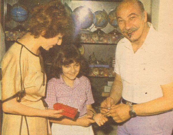 Yılmaz Gruda eşi Ayşen Gruda ile beraber ikokuldan mezun olan kızları Elvan'ın diploma törenindeler. Çift, kızlarına diploma hediyesi olarak aldıkları kol saatini verirken...(1979)