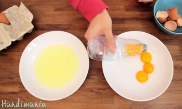Yumurtanın sarılarını ayırmanız gerekiyorsa küçük bir pet şişe kullanın. İçindeki havayı biraz boşaltıp şişeyi büktüğünüzde ve yumurta sarısının üzerine getirdiğinizde, şişe bir damladanlık gibi yumurta sarısını içine çekecektir.